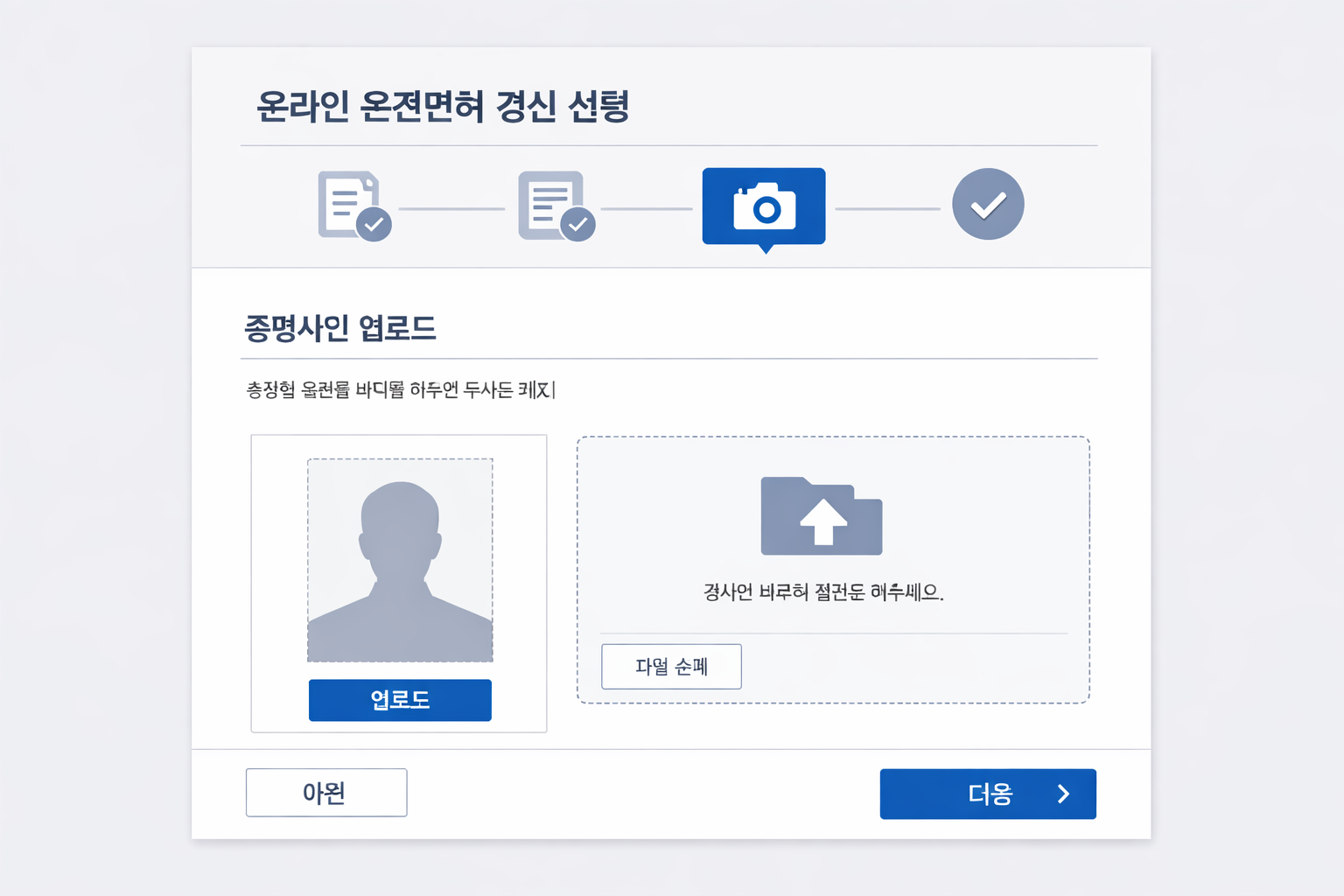 ※ 온라인운전면허갱신 신청 화면과 사진 업로드 단계 예시