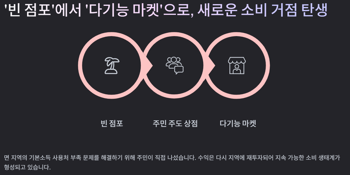 무엇보다 지역 주민이 직접 운영에 참여하거나 지역 특산물과 연계할 수 있다는 점에서 의미가 큽니다. 농어촌 기본소득이 지역 안에서 쓰일 수 있는 곳이 늘어나면 정책 효과도 더 커집니다. 사용처가 부족하면 소비는 분산되거나 외부로 새기 쉽지만, 생활 동선 안에 매력적인 거점이 생기면 지역 내 소비 체류 시간이 길어집니다. 빈 점포를 다기능 마켓으로 전환하는 방식은 바로 이 문제를 해결하는 대안으로 떠오르고 있습니다.